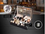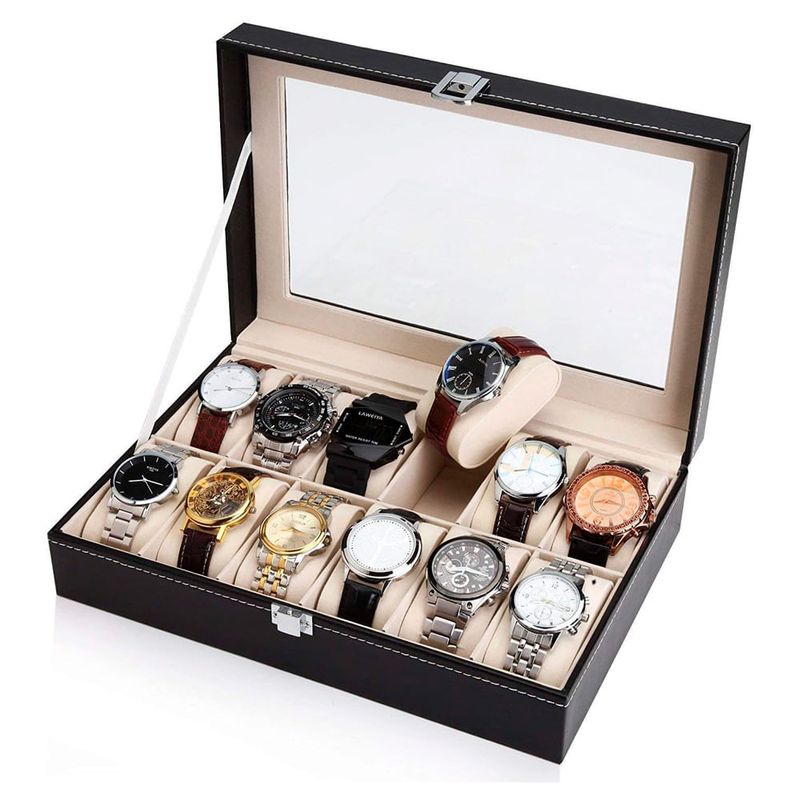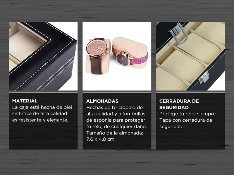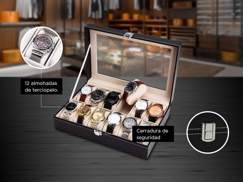 El diseño con tapa de cristal no solo protege los relojes y joyas del polvo y arañazos, sino que permite una vista amplia para elegir el reloj adecuado para cada ocasión. Además, las almohadas pueden removerse, dejando espacio para otros accesorios como gemelos, aros, pulseras, collares y artículos de joyería.