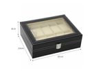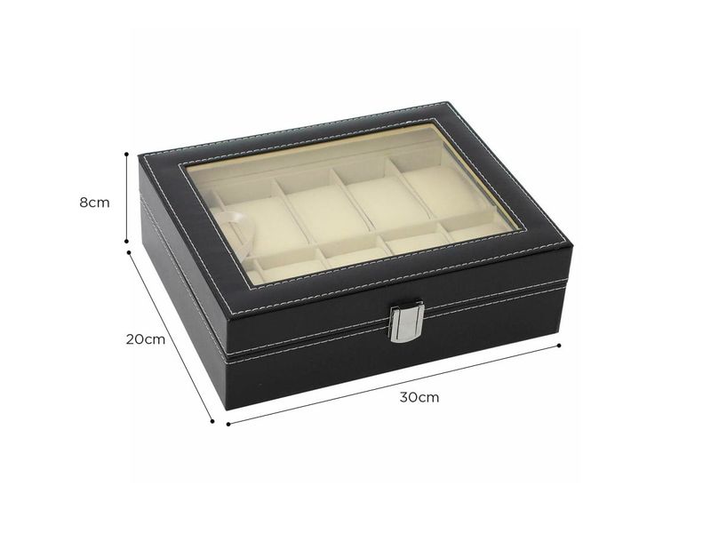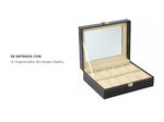 Este elegante estuche cuenta con capacidad para 12 relojes y una tapa superior con ventana transparente de cristal que le proporciona un aspecto sofisticado, además de facilitar la visualización de los relojes sin necesidad de abrir la caja. Las bisagras, cerradura y llave de metal ofrecen máxima protección, mientras que las almohadillas interiores son extraíbles e independientes para mayor versatilidad.