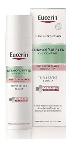 El Sérum triple efecto Eucerin DermoPURE Oil Control posee tres beneficios claves: Anti-brillo, porque proporciona un acabado seco y mate de larga duración; Anti-imperfecciones debido a que disminuye las imperfecciones y previene su reaparición; y Anti-manchas ya que reduce las manchas persistentes post-acné. Los primeros resultados visibles aparecen después de dos semanas de uso regular y mejora continuamente con el tiempo. Su fórmula combina Thiamidol, Licochalcona A y Ácido Salicílico. Está probado en pieles grasas, propensas al acné o impurezas.