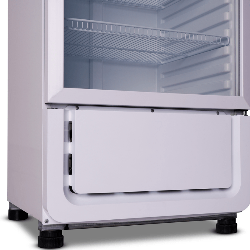 Compresor de última generación. Controlador electrónico de temperatura. Puerta doble vidrio exterior templado Low-e. Estantes con tratamiento anti corrosión. Condensación: aire forzado. Evaporador: aletado. Aluminio-aluminio. Condensador acero libre mantenimiento. Forzadores: polo de sombra. Condensador acero libre mantenimiento. Agente espumante: ciclo Isopentano (libre CFC) Gas refrigerante ecológico (R290). Interior gabinete: PAI. Exterior gabinete: galvanizado - prepintado. Iluminación por plafón Led.