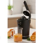 Este exprimidor eléctrico funciona con una frecuencia de 50/60 Hz y su elegante color negro lo hace un accesorio moderno y funcional para cualquier cocina.