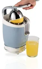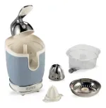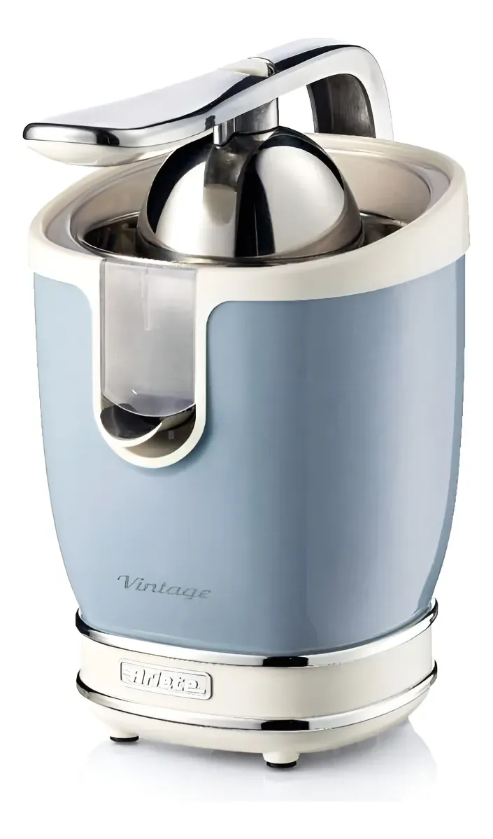 Exprimidor eléctrico de cítricos con palanca, de diseño vintage. Cuerpo metálico, dos conos para frutas grandes y pequeñas, y boquilla antigoteo.