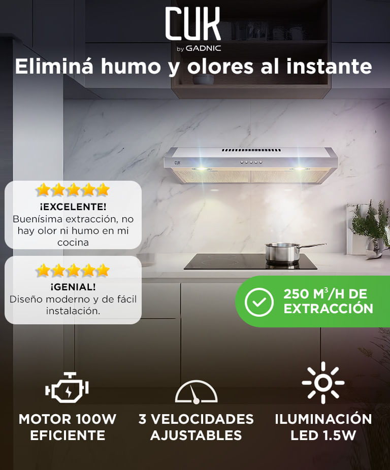 El extractor CUK by Gadnic EXT55100 elimina humo, grasa y olores con flujo de aire de 250 m³/h, ideal para cocinas domésticas medianas.