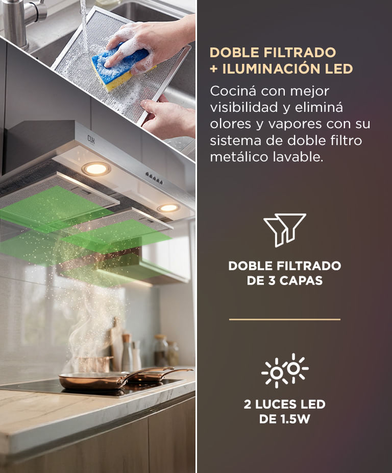 2 luces LED de bajo consumo para mejor visibilidad mientras cocinás.