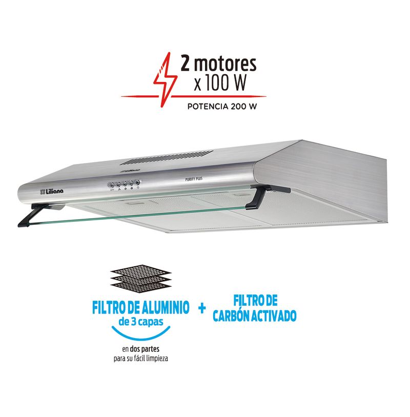 • 2 Filtros de aluminio de 3 capas de fácil limpieza + 2 filtros de carbón activado.