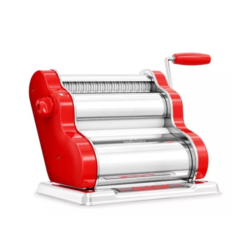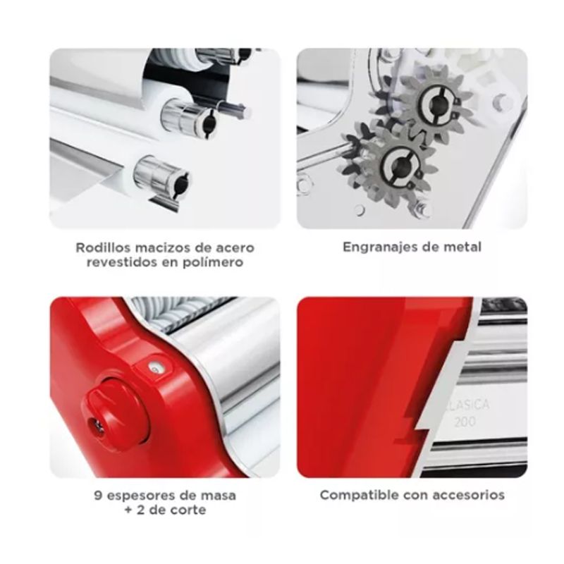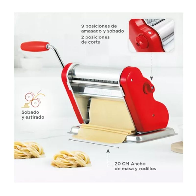 Máquina elaboradora de Pasta Casera. Fácil de usar y con un diseño único y personalizado que te permitirá preparar mayor cantidad de pasta en menos tiempo, gracias a sus 20cm de ancho de masa.