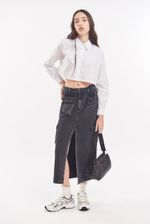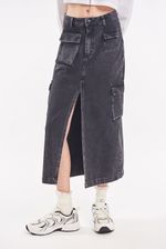 Falda larga por debajo de la rodilla de gabardina rígida, con multi-bolsillos laterales cargo. Lavado gastado.