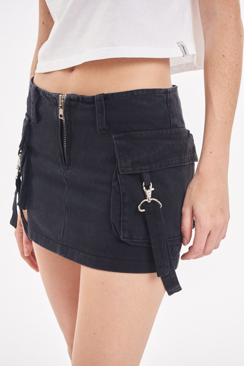 Falda corta en gabardina 100% algodón con bolsillos cargo en los laterales y tiras con mosquetones.