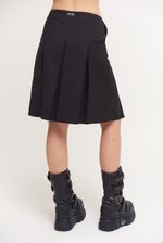 Falda tipo sastrera lisa evasé, con tableado ancho en frente y espalda, de largo final por sobre las rodillas y tiro medio-bajo. Acceso lateral mediante cierre invisible, bolsillos laterales y presillas anchas en cintura.