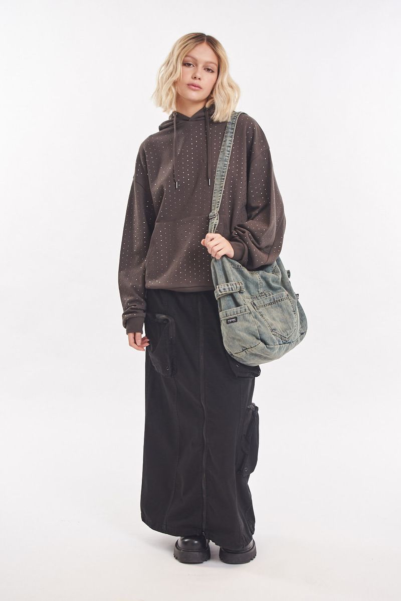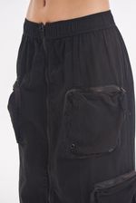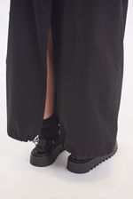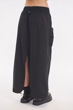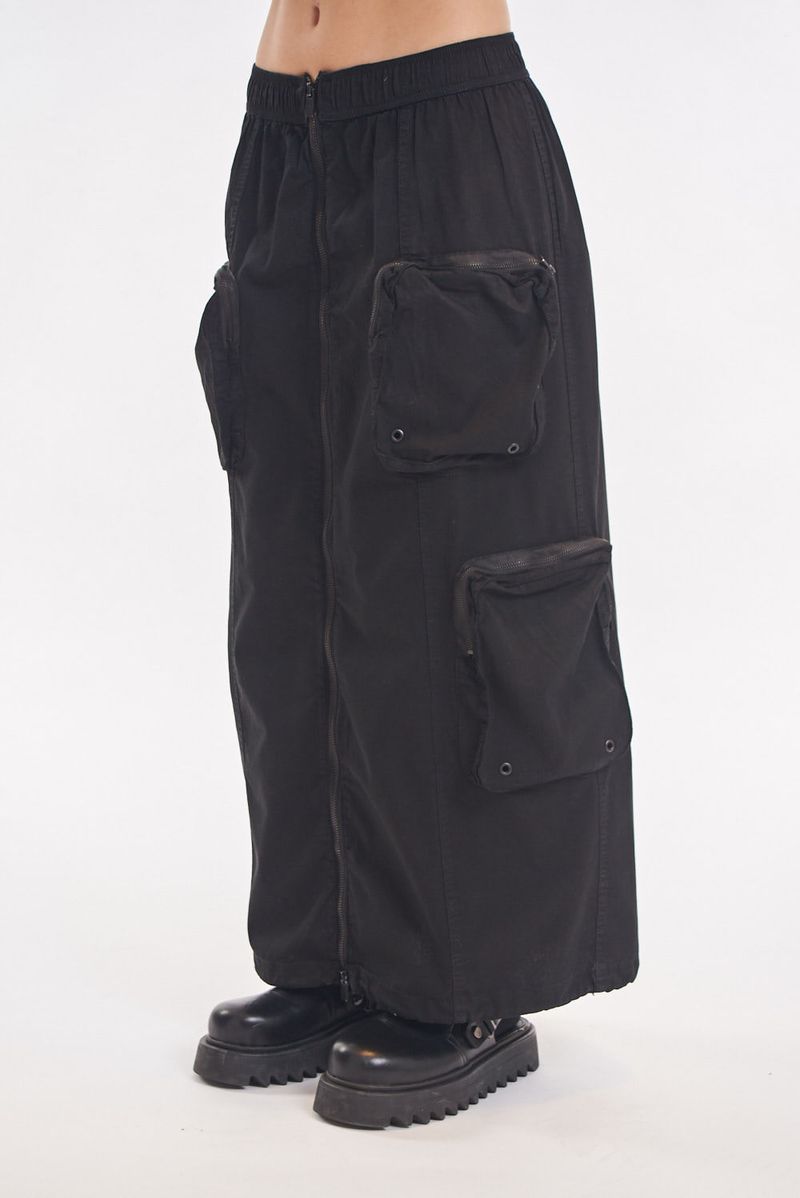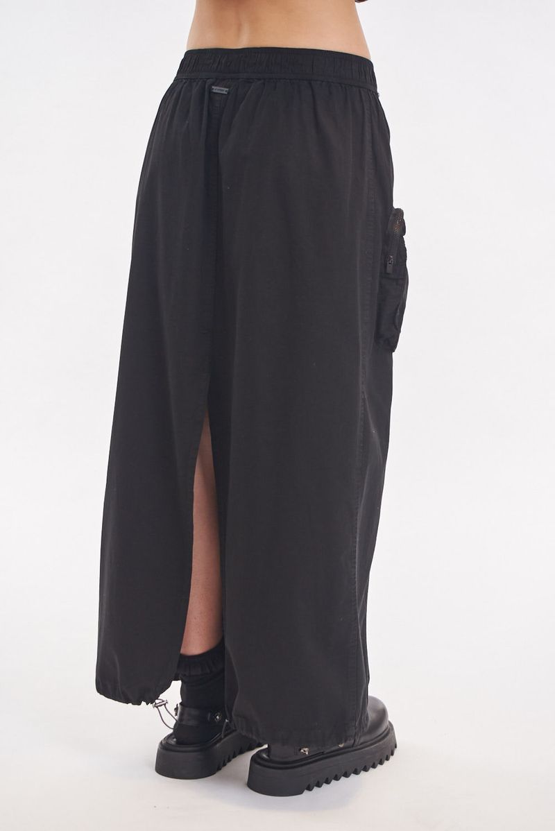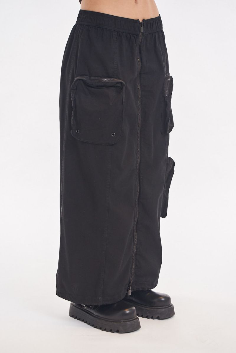 Falda larga tipo cargo de gabardina liviana con multiples bolsillos. Bolsillos con fuelle y cierre metálico. Cierre central metálico delantero. Ajuste en cintura con elástico. Ajuste en bajo con elástico y tanca para regular. Avíos marcarios.