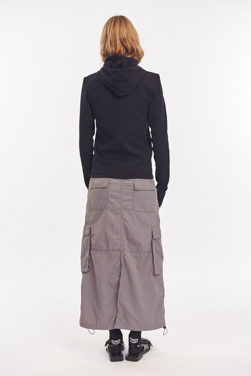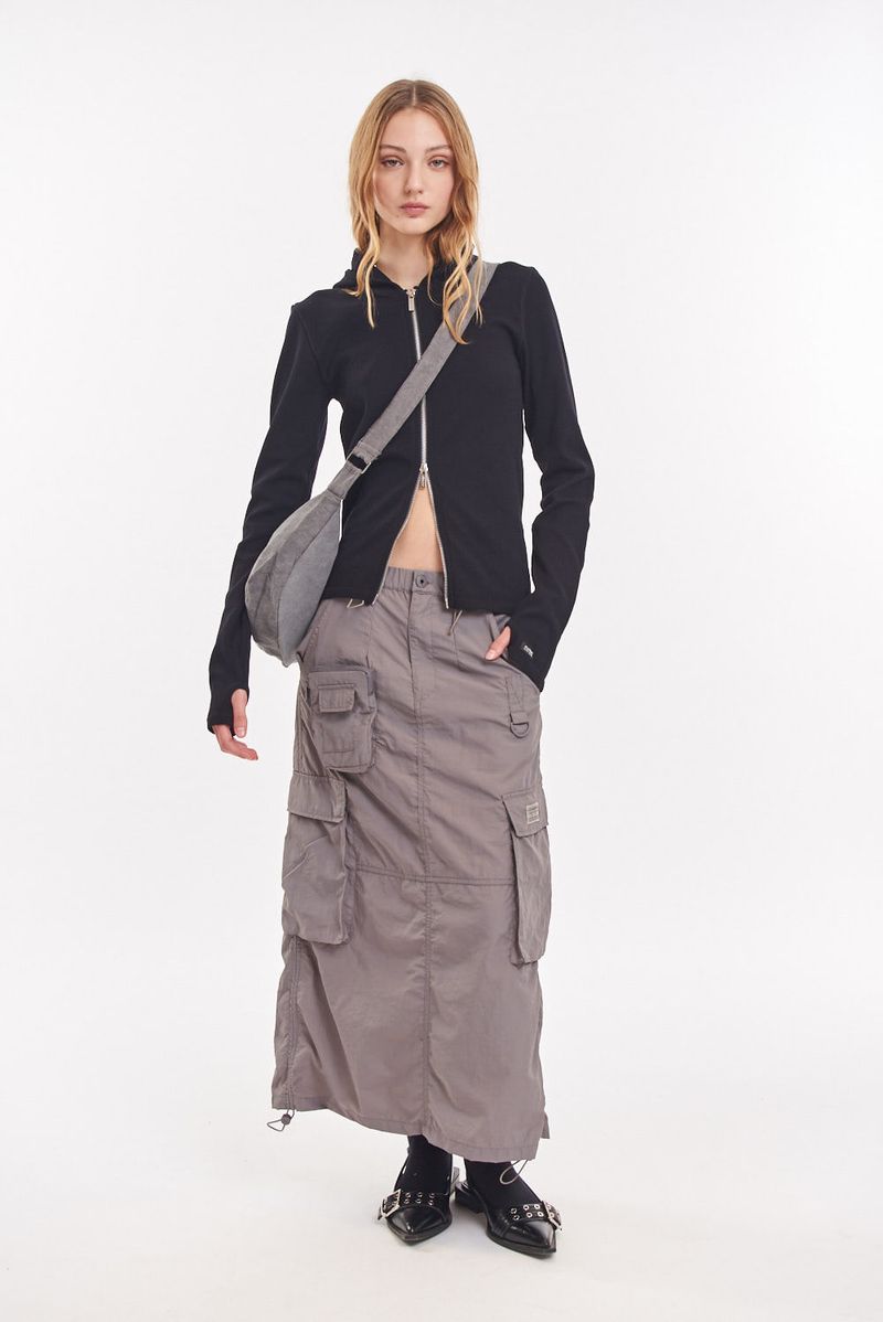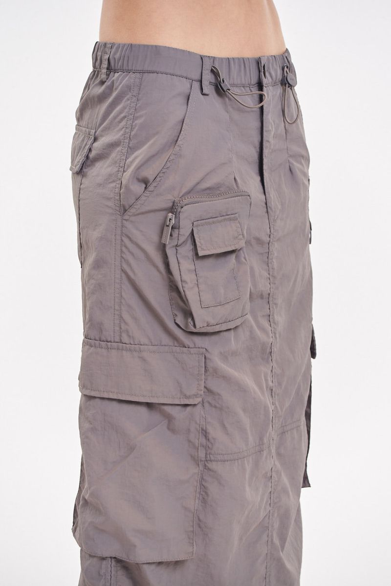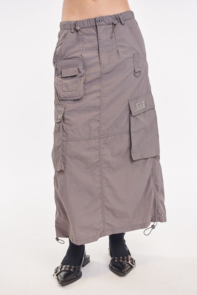 Falda larga de nylon liviano con multiples bolsillos. Cintura con elástico ancho y elastico redondo con tancas para ajustar. Tajo en espalda. Elástico redondo en bajo con tancas para ajustar. Avíos marcarios 47street