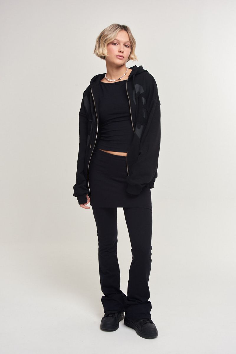 Falda pantalón de algodón con lycra pesada. La falda está unida por la cintura, simulando estar puesta por arriba del pantalón. Tiro medio, pierna tipo oxford. Grifa institucional