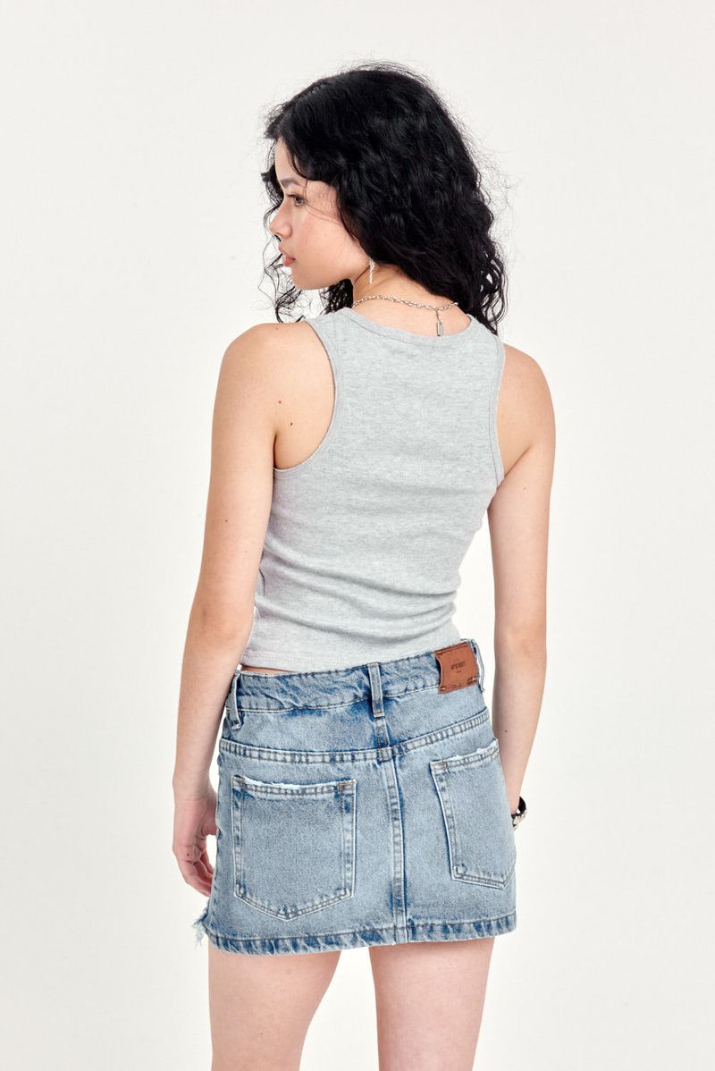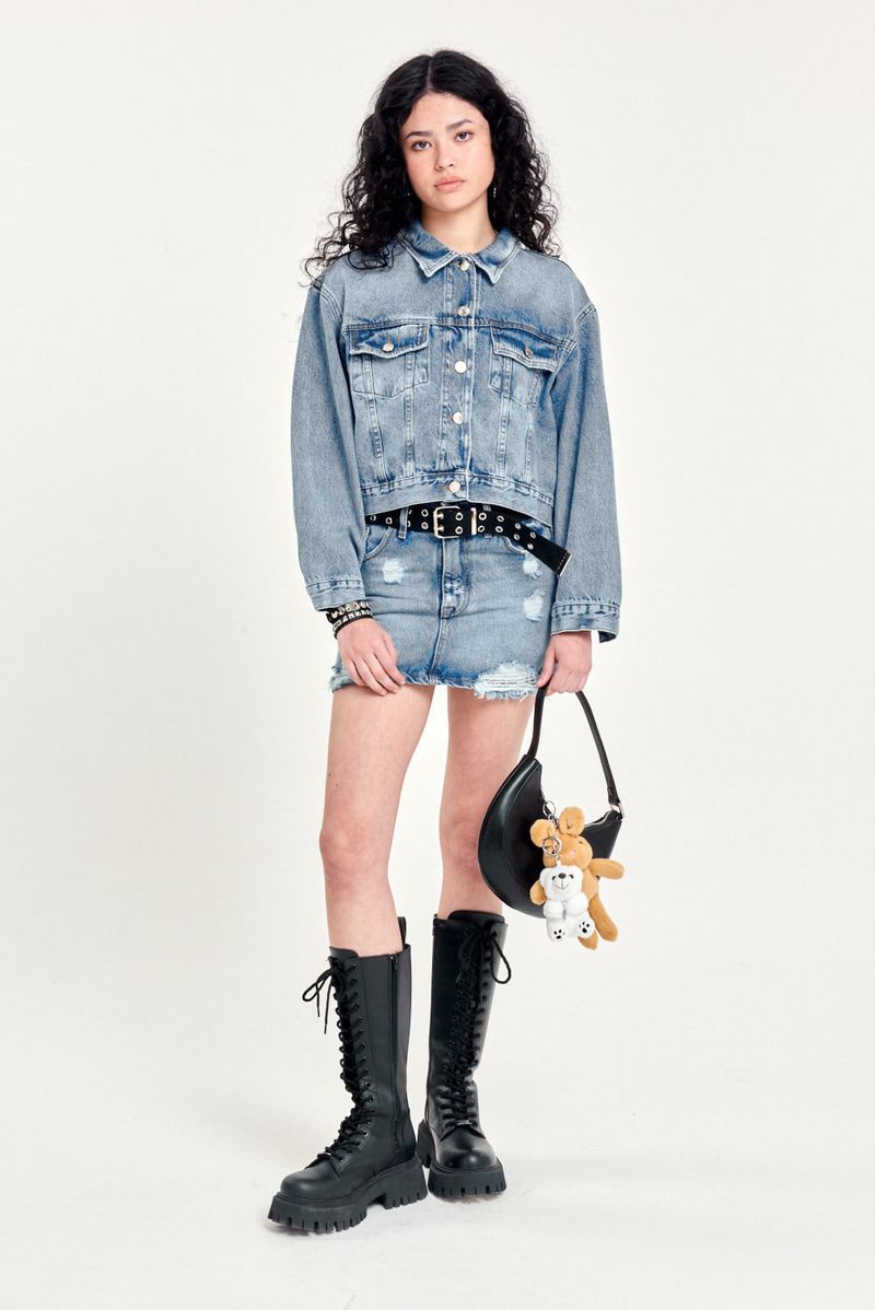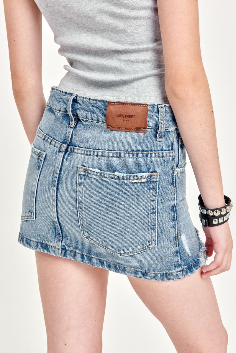 Falda de denim con cinco bolsillos, ruedo con roturas y tiro medio. Tiene efecto gastado, remaches y botón metálico, con calce ajustado estilo vintage. El lavado se realiza de forma artesanal, lo que le da identidad a cada prenda: no vas a encontrar dos iguales.