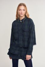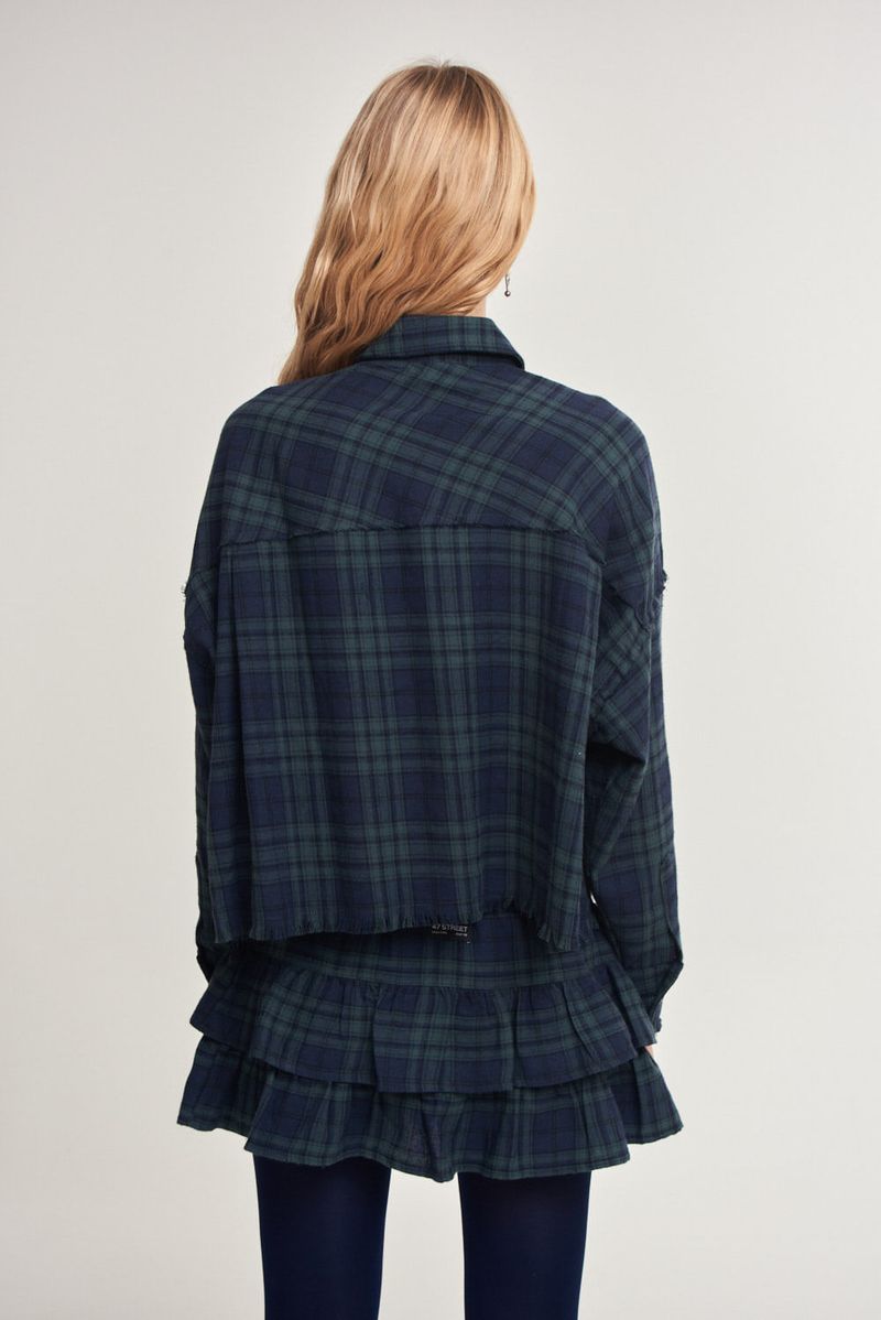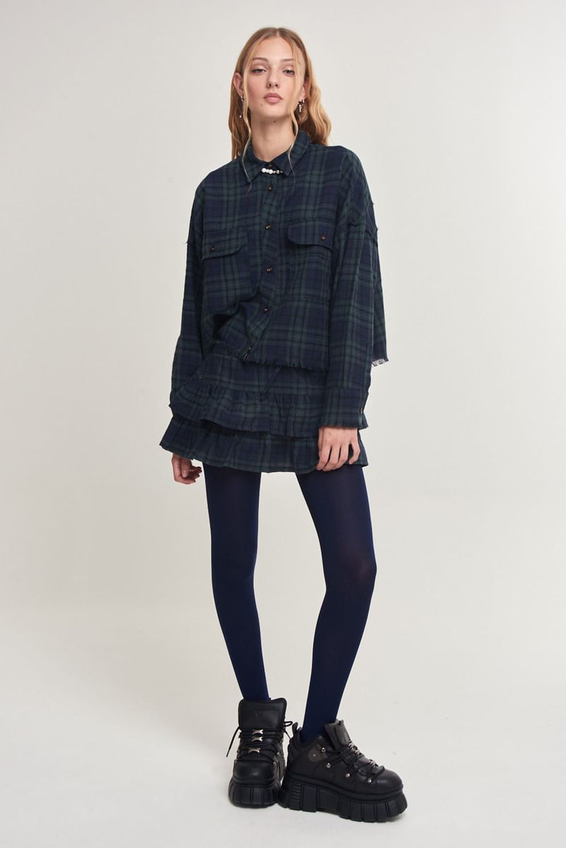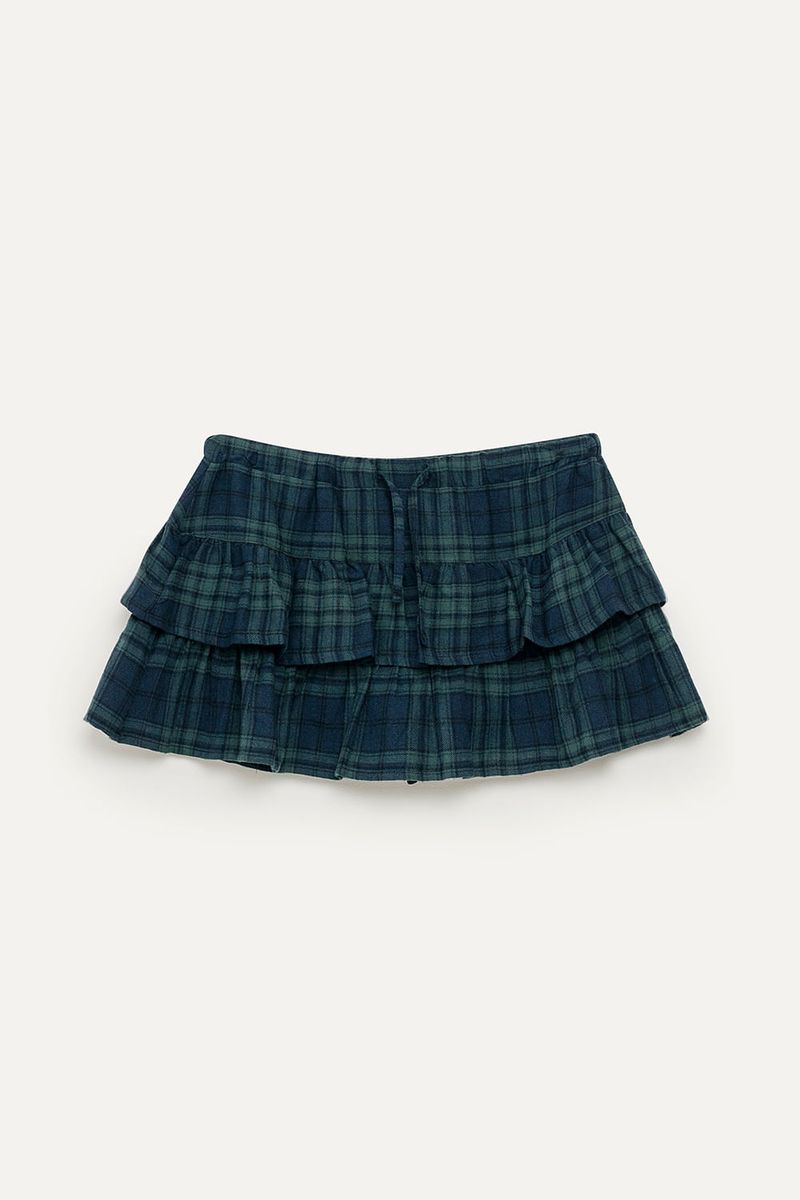 Falda corta tiro bajo, de villela con motivo escocés, en tres capas de volados superpuestos. Cintura con elástico interno y lazo para anudar. MIni short interno de punto en tela tipo creppe elastizado.
