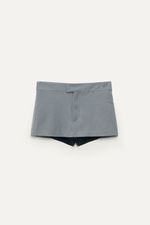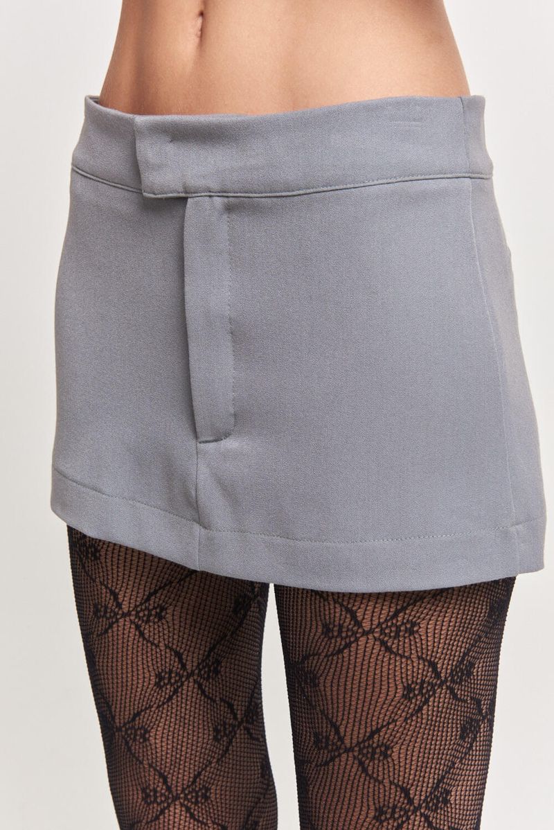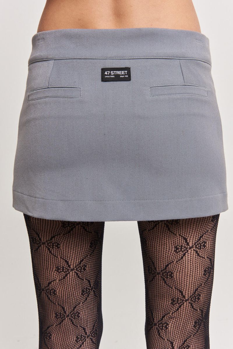 Falda mini adherente tipo sastrera con spandex, tiro medio, con mini short interno. Cintura cruzada y bolsillos traseros simulados con vista. Etiqueta central con el logo de la marca,a la vista en centro de cintura de espalda.