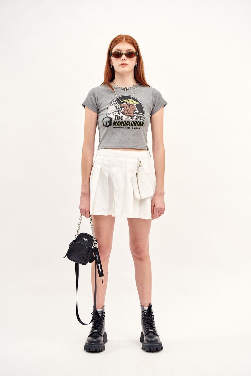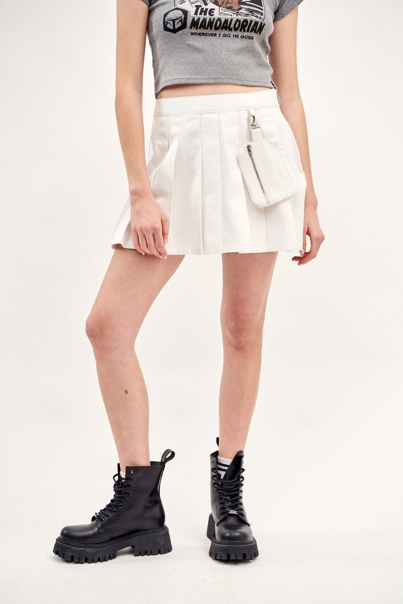 Falda de gabardina de tablas, con cierre lateral. Posee detalle de monedero colgante con cierre.