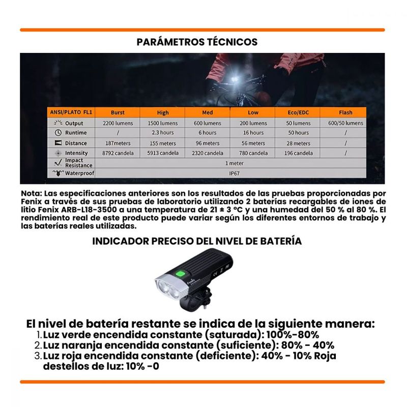 Equipado con componentes avanzados, el foco de bici puede operar en rangos de temperatura de -35ºC-45ºC.