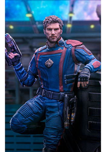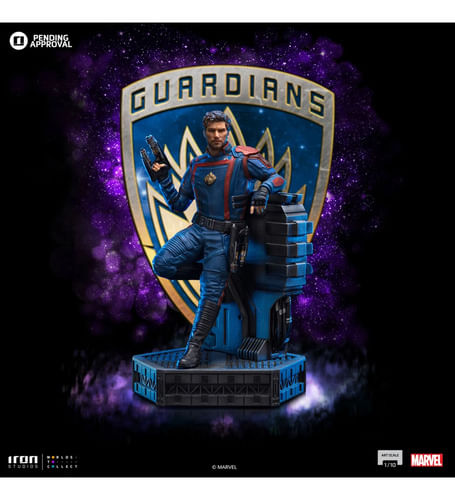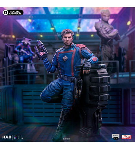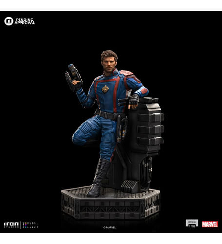 En el pasillo de las instalaciones de investigación móviles del villano altamente evolutivo en Counter-Earth, el héroe aventurero espacial, mitad celestial y mitad humano, empuña uno de sus Quad Blasters en su mano derecha, manteniendo el otro en su cinturón mientras se inclina relajado. El ex famoso forajido intergaláctico conoce y afronta su responsabilidad como líder de los Guardianes de la Galaxia de una manera valiente, ayudando a los planetas y a las poblaciones necesitadas. Presentada de primera mano en la San Diego Comic-Con 2023, una vez más en su stand, Iron Studios trajo la estatua "Star-Lord - Guardianes de la Galaxia Vol. 3 - Art Scale 1/10", con el legendario líder del grupo más querido. de héroes inadaptados en la galaxia, presentando al héroe con su traje azul con detalles en rojo, inspirado en su versión de los cómics, con los rasgos faciales detallados meticulosamente fieles al actor Chris Pratt, sobre una base de diorama que recuerda el interior de la Arête. Laboratorios, en una serie con las estatuas de Groot y Rocket completando el conjunto.