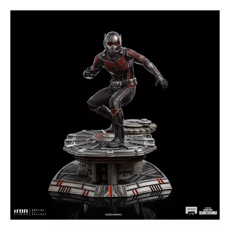Con partículas subatómicas que aumentan y reducen su masa y densidad, el ex ladrón convicto y héroe reacio vuelve a llevar el traje especial que le permite manipular su tamaño y fuerza y regresa al misterioso Reino Cuántico, un universo extradimensional accesible a través de la magia, a través de las Partículas Pym únicas, o a través del portal interdimensional llamado Túnel Cuántico. Iron Studios trae la estatua "Quantumania Ant-Man - Quantumania - Art Scale 1/10", con el Avenger en miniatura listo para la acción sobre una base de plataforma inspirada en la arquitectura de la ciudad futurista Axia del Reino Cuántico, basada en la película número 31 del MCU, donde Scott Lang y su familia se enfrentan a la amenaza de Kang, el Conquistador.