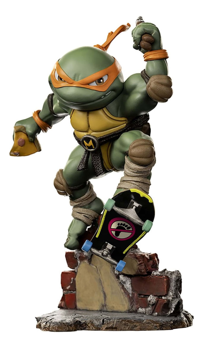 Con una rebanada de pizza, su comida favorita, en una mano y uno de sus Nunchakus en la otra, salta con su patineta en una pared de ladrillos en el pedestal. Así, Iron Studios presenta la estatua “Michelangelo - TMNT – MiniCo”, trayendo al miembro más feliz y juguetón de las Tortugas Ninja. Leal y cariñoso, Mike o Mikey como le llaman sus hermanos, es el más joven del grupo, conocido por su optimismo, sus bromas y su amor por el skate y la pizza. Usando una máscara naranja, su nombre proviene del arquitecto y poeta italiano Michelangelo Buonarroti.