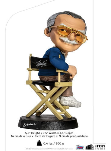 FIGURA STAN LEE (BLUE) POW! MINICO STNLEE41721-MC El carismático y legendario Stan Lee gana su figura en la simpática versión de la línea Mini Heroes de Minico. Honrando su carrera en los teatros, Stan Lee Minico ha estado sentado en una silla de actor tradicional con su nombre en el respaldo, mirando hacia atrás con su sonrisa siempre presente y en una base con la expresión que fue su marca registrada \"Excelsior\"! Presente en breves pero llamativas apariciones en casi todas las adaptaciones del Universo Cinematográfico de Marvel, Lee fue escritor, editor, publicista, productor, director, empresario y actor, pero sus mayores contribuciones a Marvel fueron como co-creador de íconos de cómics como Man. -Spider, Hulk, Doctor Strange, Fantastic Four, Daredevil, Black Panther, X-Men y muchos más. Trabajando junto a otras leyendas como Jack Kirby, Steve Ditko, Bill Everett, John Romita Sr, Gene Colan entre otros. Iron Studios presenta la estatua de Stan Lee MiniCo con licencia oficial. Nuestras estatuas y juguetes coleccionables pintados a mano son el mejor regalo para usted o sus seres queridos. Nuestras figuras de acción se adaptan a su escritorio o estantería. ¡Haz crecer tu colección con este juguete coleccionable! Stan Lee (Azul) – ¡POW! – Minico Licencia: Stan Lee Escala: Figuras Minico Características: – Creación: Iron Studios – Fabricado en plástico (PVC) - Pintado a mano – Incluye pantalla base Dimensiones del producto: 5,5 pulgadas (alto) x 3,5 pulgadas (ancho) x 3,5 pulgadas (largo)