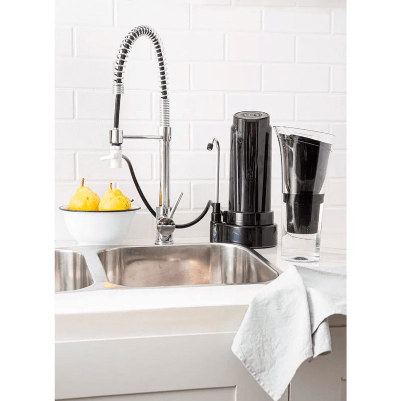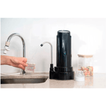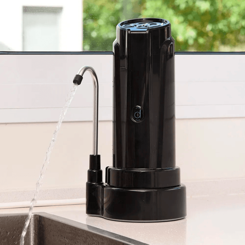 Purificador portátil de alta eficiencia con filtración en 4 etapas, diseñado para eliminar cloro, metales pesados, sedimentos y otras impurezas. Se instala fácilmente sobre la mesada y brinda agua pura al instante.