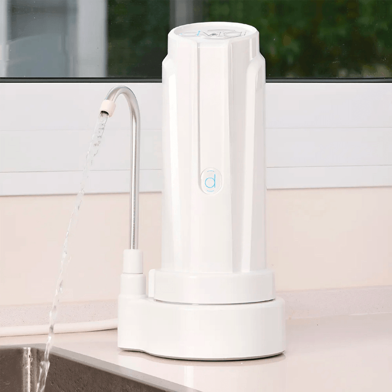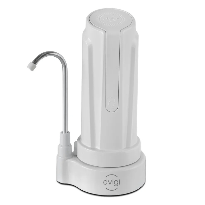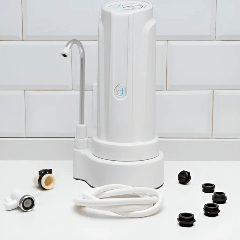 Purificador portátil de alta eficiencia con filtración en 4 etapas, diseñado para eliminar cloro, metales pesados, sedimentos y otras impurezas. Se instala fácilmente sobre la mesada y brinda agua pura al instante.