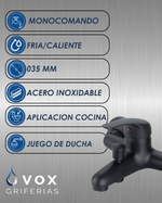 Fabricado en zinc, este modelo V25001B garantiza durabilidad y resistencia al uso diario. El soporte incluido facilita su instalación y uso, mientras que su diseño monocomando permite un control sencillo de la temperatura y el flujo del agua. Ideal para quienes valoran la calidad y el diseño en cada detalle de su hogar.