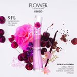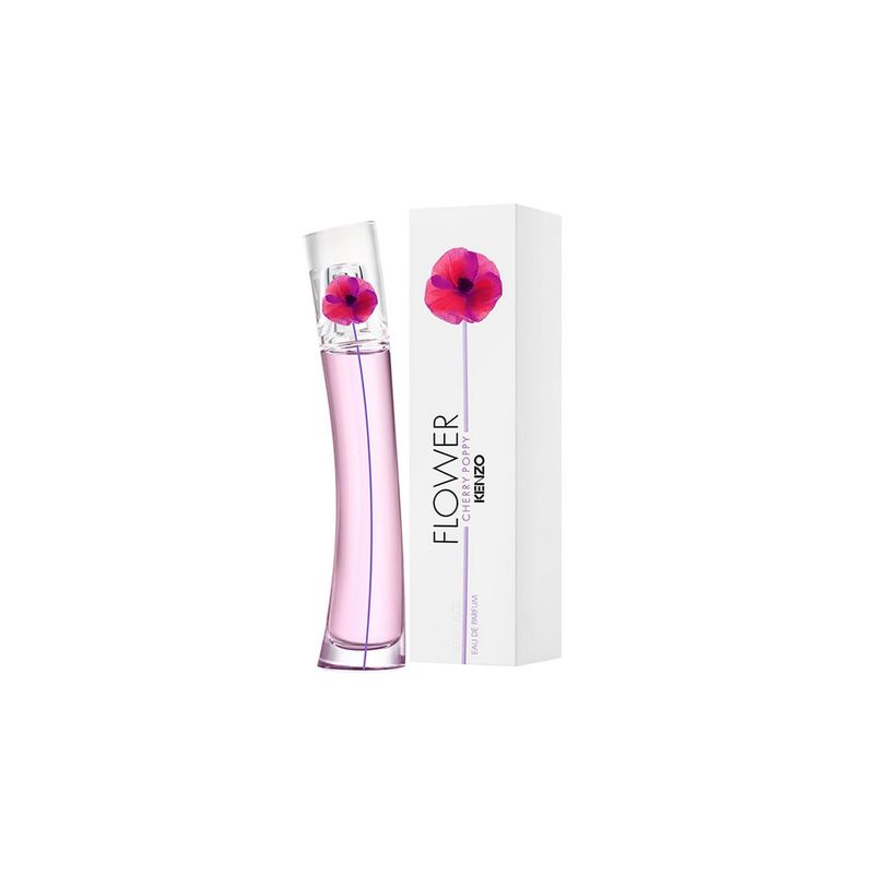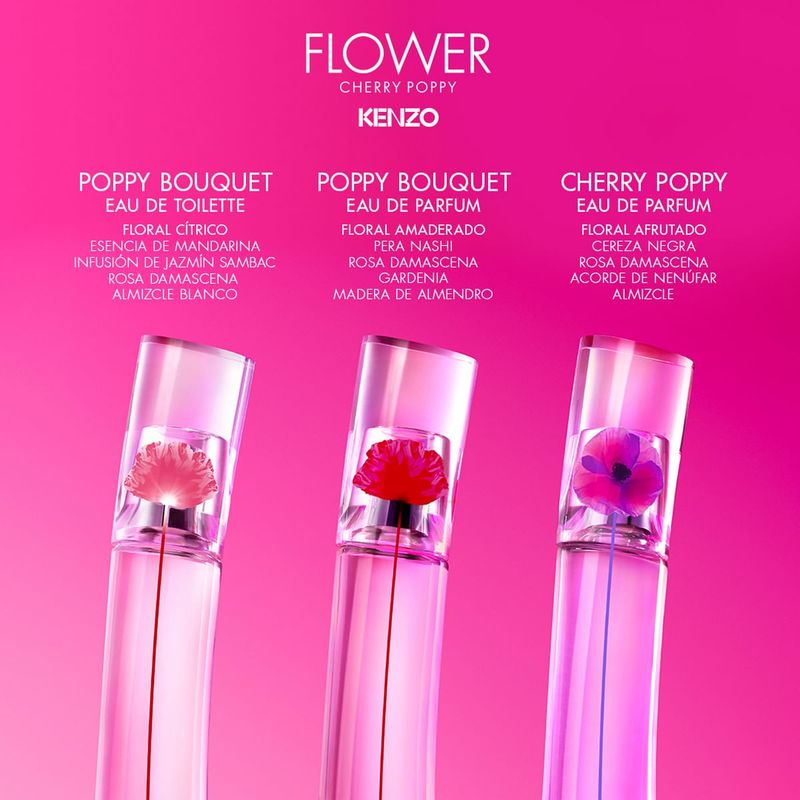 El legendario frasco de FLOWER está adornado con la amapola rosa y violeta de KENZO, y su corazón es una tentadora explosión de cereza.