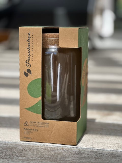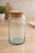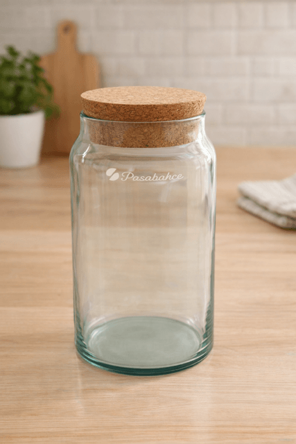 Frasco de vidrio reciclado de marca Pasabahce con tapa corcho.