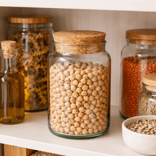 • En una despensa organizada con otros frascos transparentes.