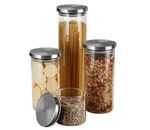 Juego de 4 tarros herméticos de cristal con tapa de acero inoxidable para almacenar diferentes alimentos, manteniéndolos frescos y conservando su calidad.