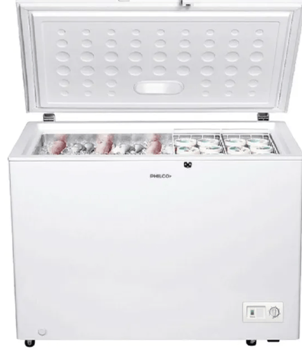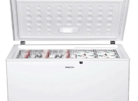 Freezer horizontal Philco de 400 lts, cuenta con 2 canastos removibles de acero, manija externa con cerradura, luz interior led, 4 ruedas, termostato regulable con triple función ( freezer/conservador enfriador), bisagra anti-balanceo, freezer 4 estrellas y usa gas ecológico (capacidad bruta 410 neta 400 lts).