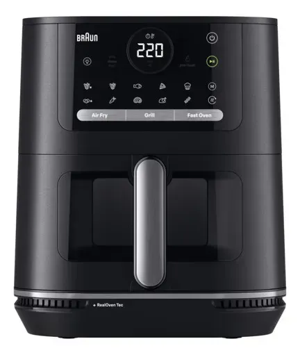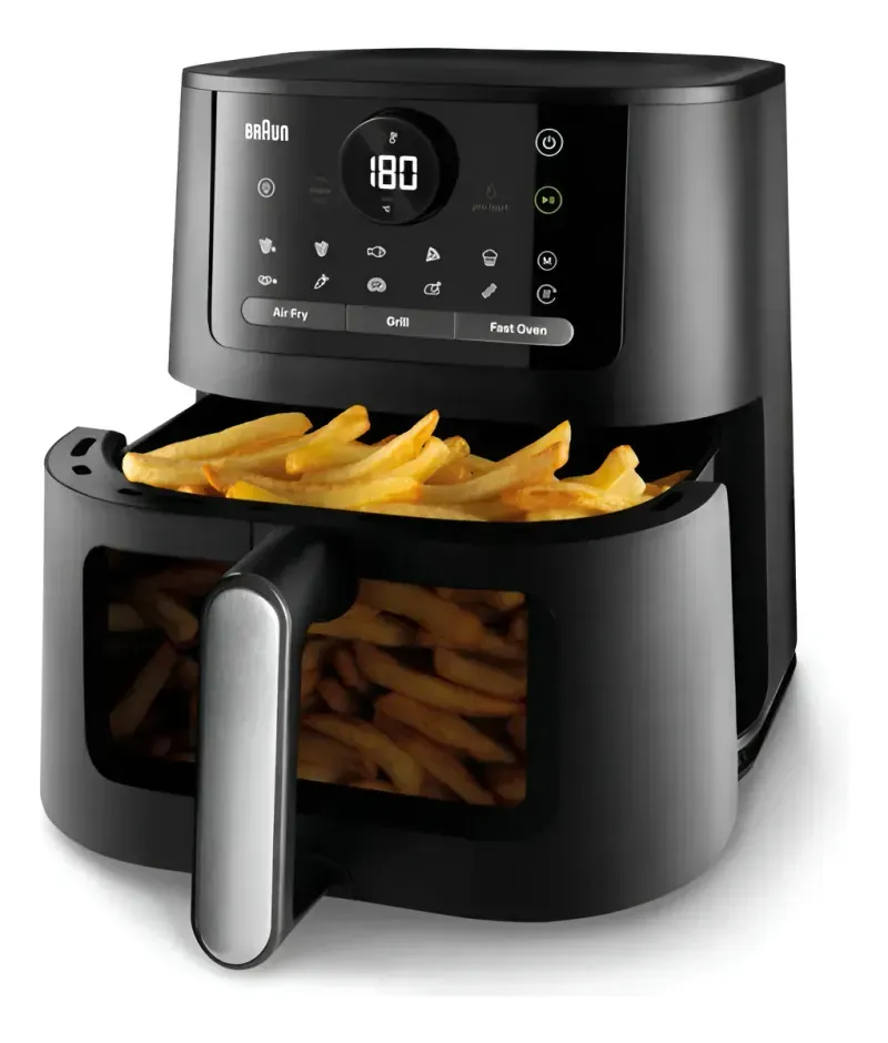 Con la nueva MultiFry 5 de Braun podrás freír con aire, asar y hornear todas tus recetas saludables y disfrutar de unos resultados más crujientes y rápidos que en un horno tradicional.* Gracias a la práctica ventana de visualización, podrás comprobar el estado de tus alimentos en cualquier momento. Gracias a los elementos calefactores duales de RealOven Tec 3 en 1, los alimentos se beneficiarán de una distribución de calor de nueva generación y obtendrás comidas crujientes de forma mucho más rápida. No importa que vayas a preparar patatas fritas crujientes, asar vegetales, hornear un pastel o asar pollo, MultiFry 5 puede con todo, ahorrándote tiempo y espacio en el proceso. Características Aplicación 3 en 1 Freidora de aire, parrilla y FastOven: Prepara patatas fritas crujientes, asa verduras, hornea un pastel o haz pollo a la parrilla. Temperaturas ajustables Cada programa es fácilmente ajustable para adaptarse a tu gusto. El termostato electrónico permite regular con precisión la temperatura de 80 a 220 grados*. *sólo en Braun HF5060 y Braun HF5073. Capacidad de 6,0 L El cajónes espacioso y te ofrece gran capacidad para cocinar diversos tentempiés, guarniciones o platos principales, como 1,5 kg de pollo o 1,6 kg de patatas fritas. Hasta un 90 % menos de grasa* Disfruta de recetas saludables. Gracias a nuestra tecnología RealAir, obtendrás todo el sabor rico que te gusta con poco o nada de aceite. *En comparación con las patatas caseras preparadas en la freidora de aceite convencional. Ahorro de energía Ahorra hasta un 70 % de energía cuando se utiliza en el modo Eco, en comparación con el modo Turbo. 20 programas de cocción automáticos Facilita todo el trabajo y aumenta la variedad de platos que podrás preparar con facilidad. Fácil de limpiar Sin problemas de limpieza. La cesta y la rejilla se pueden extraer fácilmente y son aptas para el lavavajillas.