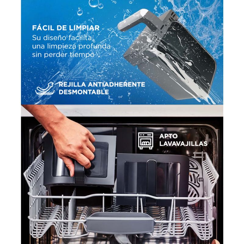 Tecnología DualZone: Dos bandejas independientes que permiten cocinar dos alimentos diferentes al mismo tiempo con distintos ajustes.