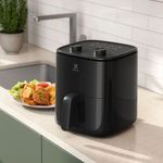 Freidora de aire Electrolux 3L con temporizador EAF05 es una airfryer de 3 litros de capacidad ideal para preparar comidas más saludables con hasta 90 % menos de grasa y 50 % menos de calorías, gracias a que cocina con poco o nada de aceite. Utiliza la tecnología Air Cooking 360° para una circulación uniforme del aire que deja los alimentos crujientes por fuera y jugosos por dentro, incluye rejilla removible con capa antiadherente para una limpieza fácil, un temporizador de hasta 60 min con apagado automático y un panel con 8 recetas sugeridas y control de temperatura ajustable (80 °C–200 °C), lo que la hace práctica y sencilla de usar para diversas preparaciones cotidianas.
