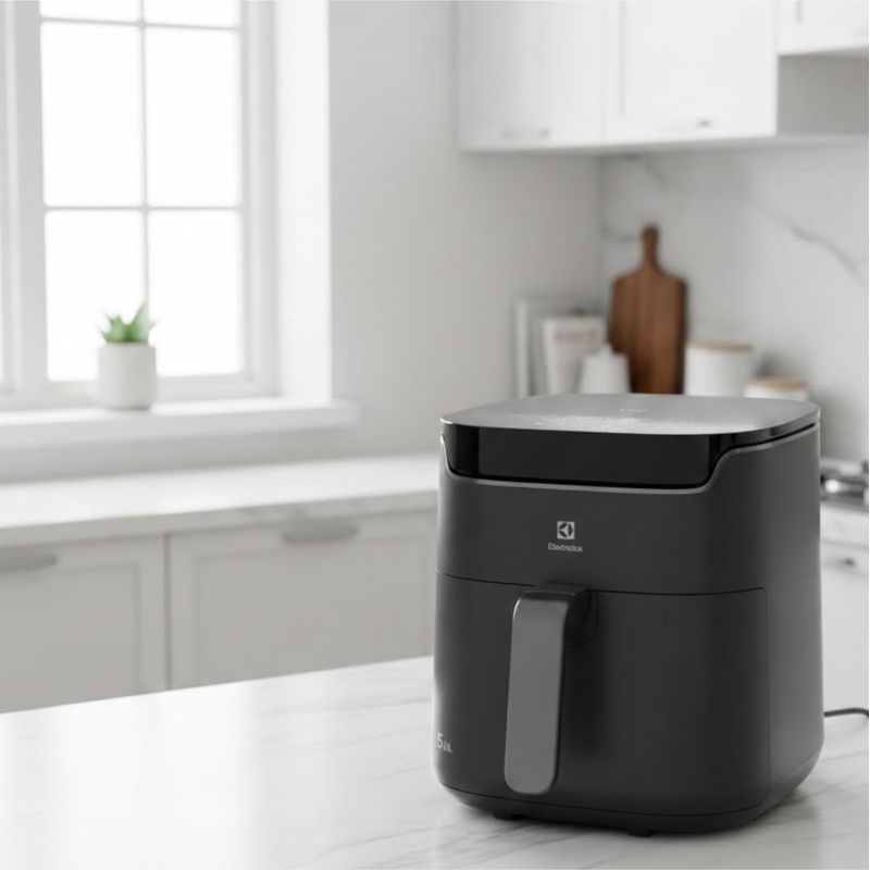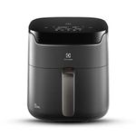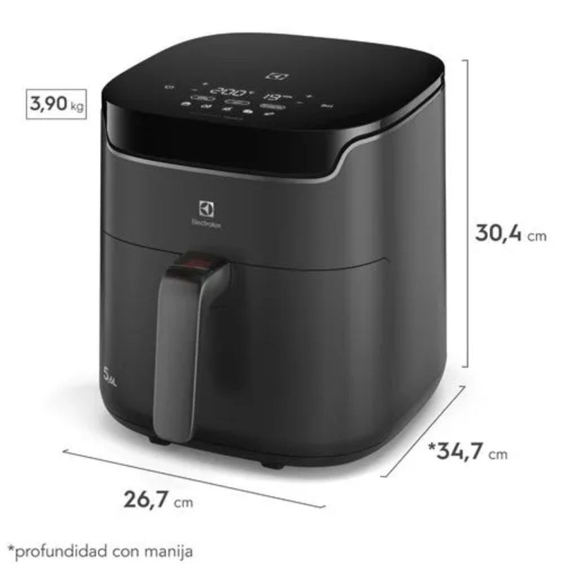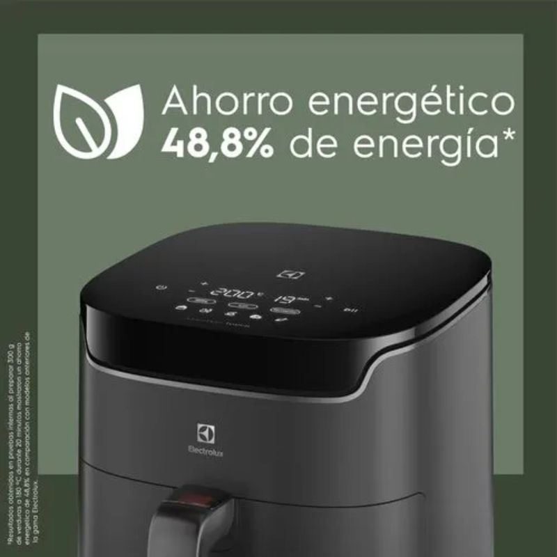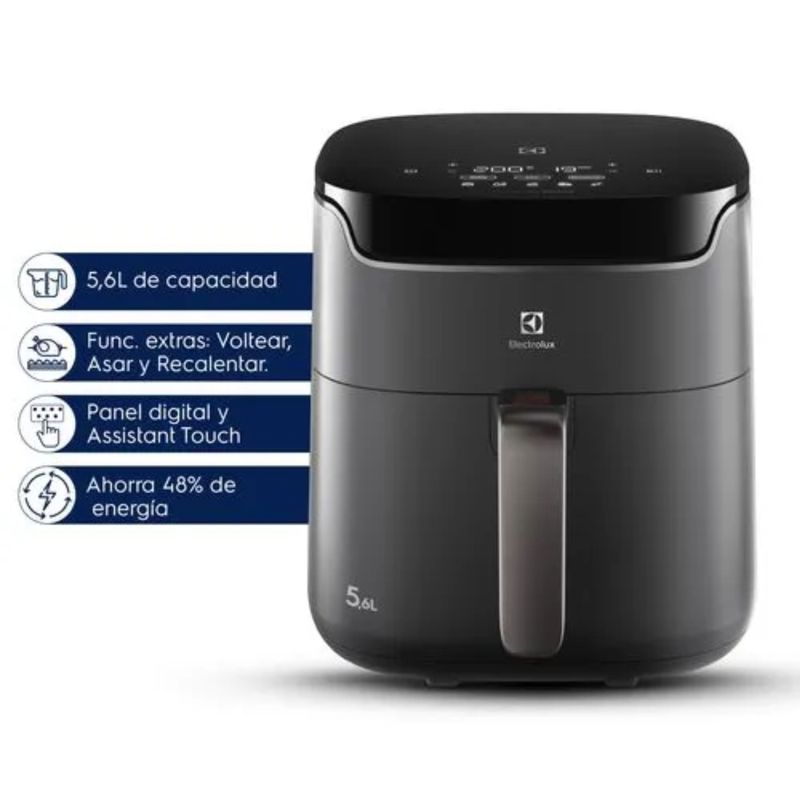 Freidora De Aire Electrolux Digital Experience Timer EAF45 5,6 L es una airfryer de gran capacidad (5,6 L) ideal para cocinar para familias o grupos, que permite preparar comidas con textura similar a la fritura tradicional y hasta 90 % menos de grasa y 50 % menos de calorías sin usar aceite. Cuenta con panel digital táctil Assistant Touch con temporizador y control de temperatura, 5 recetas sugeridas y 4 funciones (AirFry, asar, recalentar y aviso para voltear alimentos), además de tecnología Air Cooking 360° para cocinar los alimentos uniformemente y un cesto extraíble con doble capa antiadherente que facilita la limpieza y extracción de los alimentos, haciendo que tus comidas queden crujientes por fuera y jugosas por dentro.