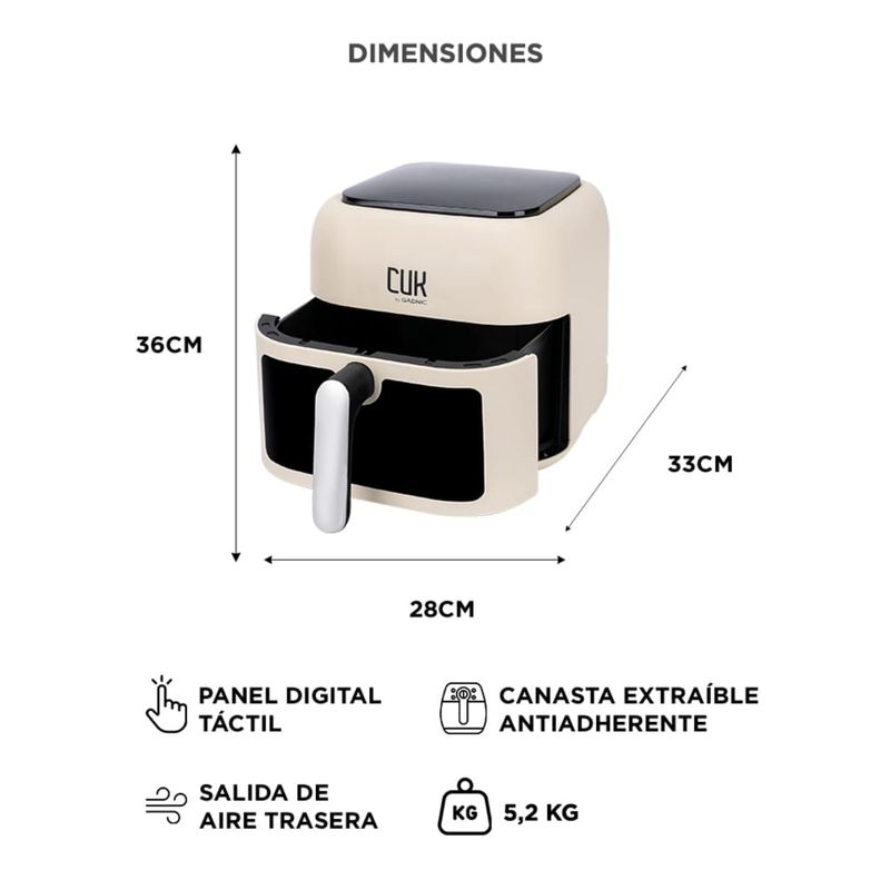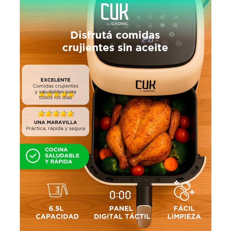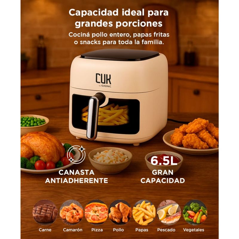 Con una capacidad generosa de 6,5 litros, esta freidora se adapta a porciones familiares y una amplia variedad de alimentos. Desde papas fritas crujientes hasta jugosas alitas de pollo, podrás satisfacer tus antojos con facilidad. Su pantalla digital y controles precisos te permiten ajustar la temperatura y el tiempo de cocción con facilidad, asegurando resultados perfectos en cada receta.