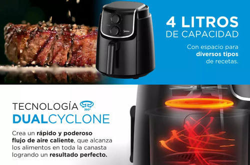 La freidora de aire Midea AF-M140BAR1 es la solución ideal para quienes buscan una forma más saludable de disfrutar sus comidas favoritas. Con una capacidad de 4 litros, permite preparar porciones generosas sin necesidad de aceite, manteniendo el sabor y la textura crujiente que todos aman. Su diseño compacto y elegante en color negro se adapta perfectamente a cualquier cocina, optimizando el espacio sin sacrificar funcionalidad.