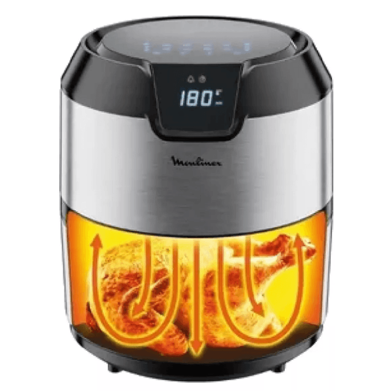 Freidora de aire, sin aceite, 16 funciones, 8 programas, ahorro energético, APP Moulinex, 4,2 L, diseño compacto, cocina saludable.