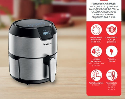 La Freidora de Aire Moulinex Fry Deluxe 4.2 Litros es la solución ideal para quienes buscan una forma más saludable de disfrutar de sus comidas favoritas. Con su capacidad de 4.2 litros, permite preparar porciones generosas para toda la familia, mientras que su potencia de 1500 W asegura un rendimiento eficiente y rápido en la cocina.