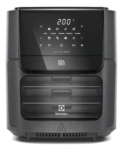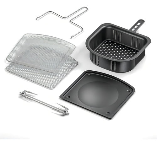 La Freidora de Aire Electrolux también incluye Kit de Accesorios: dos rejillas, brochet giratoria y gancho, bandeja de residuos y cesta interna de 3,5L.