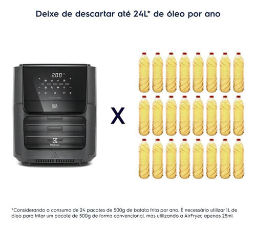 La Freidora de AireOven Electrolux Experience de 12L permite cocinar comidas caseras y sabrosas con hasta 90%¹ menos de grasa y casi 50%¹ menos calorías en comparación con la fritura tradicional en aceite. Su capacidad de 12L la hace ideal para quienes desean preparar comida saludable y sabrosa para toda la familia.