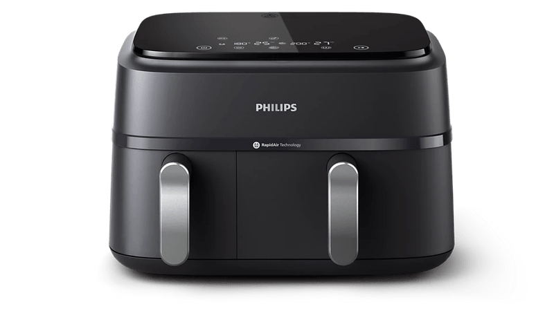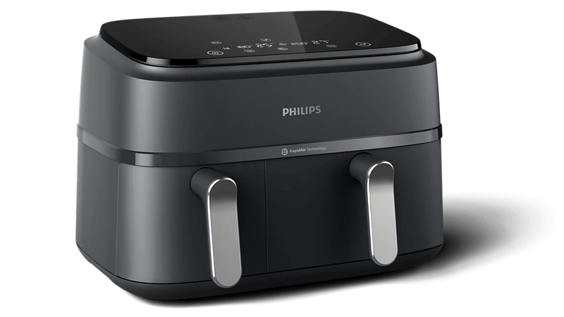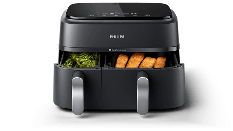 La Airfryer Philips de la Serie 3000 con dos cestas garantiza que dos platos estén listos y calientes al mismo tiempo. Disfrute de una comida sabrosa y saludable con un cajón grande para platos principales destinado a toda la familia, y un cajón más pequeño para guarniciones o comidas individuales.