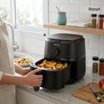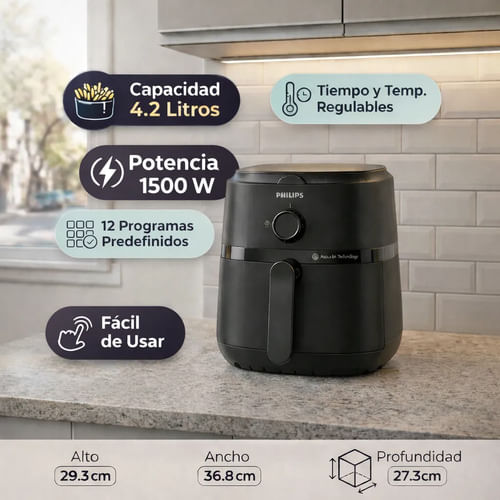 Su capacidad de 4,2 litros es ideal para preparar hasta 500 g de papas fritas, 6 muslos de pollo o 500 g de verduras.
