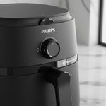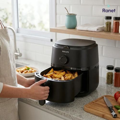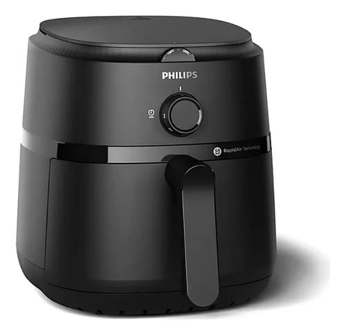 La freidora de aire Philips NA120/00 incorpora tecnología Rapid Air, que optimiza la circulación del aire para una cocción rápida, uniforme y deliciosa, ahorrando tiempo y energía frente a un horno convencional.