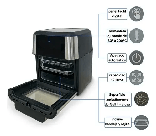 La Freidora de Aire Steel Home RA-AF12L es la solución ideal para quienes buscan una forma saludable y deliciosa de cocinar. Con una capacidad de 12 litros, este modelo digital cuenta con 12 programas de menú que facilitan la preparación de una amplia variedad de platillos, desde crujientes papas fritas hasta jugosas carnes.
