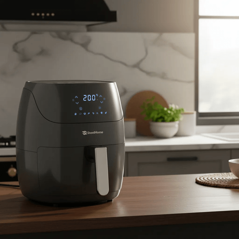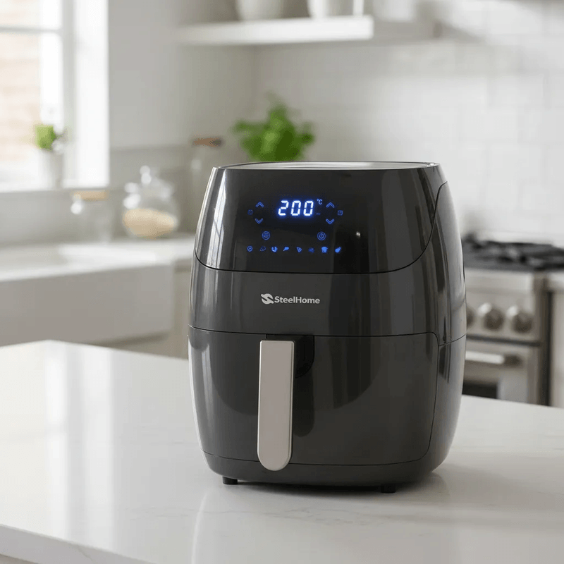 La freidora de aire Steel Home RA-AF5L Kentucky es la solución ideal para quienes buscan disfrutar de comidas deliciosas y saludables sin la necesidad de utilizar aceite. Con una potencia de 1500 W y una capacidad de 5 litros, este electrodoméstico permite preparar una variedad de platillos de manera rápida y eficiente, ideal para familias o reuniones.
