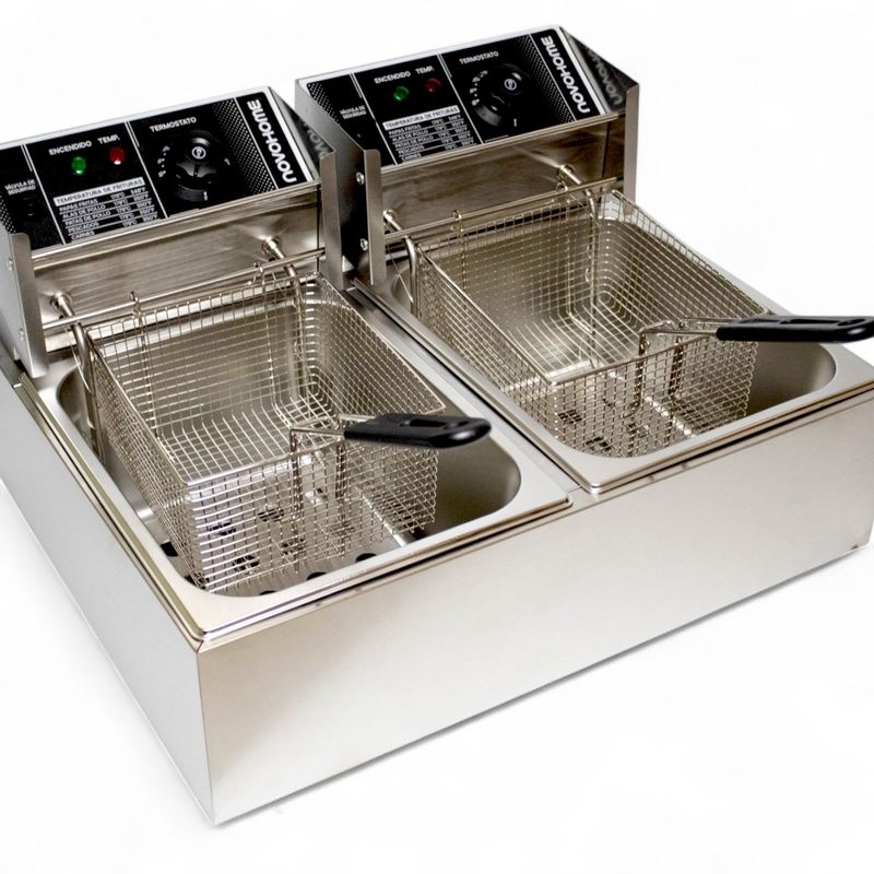 La freidora eléctrica de doble canasto Novohome está diseñada para maximizar la productividad en cocinas profesionales y exigentes. Con una capacidad de 10 litros por canasto y potencia independiente de 2500 watts por compartimiento, permite freír simultáneamente diferentes tipos de alimentos, optimizando tiempos y manteniendo los sabores por separado.