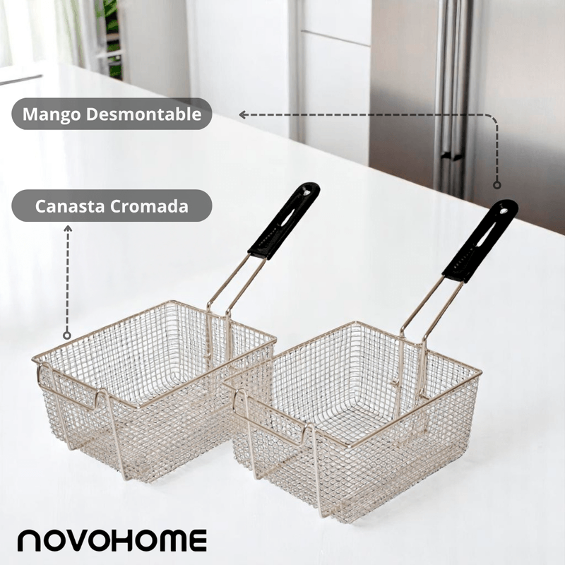 Incluye canastas cromadas con mangos desmontables, prácticas y seguras, que junto con su diseño frío al tacto, ofrecen mayor comodidad y previenen accidentes por quemaduras. Su filtro antigrasa contribuye a mantener un ambiente más limpio en la cocina, reduciendo olores y residuos.